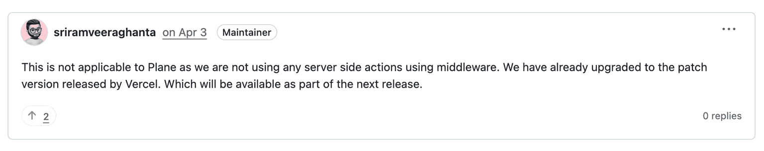 Based on this GitHub discussion, the Plane team was aware of the CVE-2025-29927 vulnerability and has confirmed that their application was not affected by it. They pointed out that Plane does not use Next.js middleware for authentication.