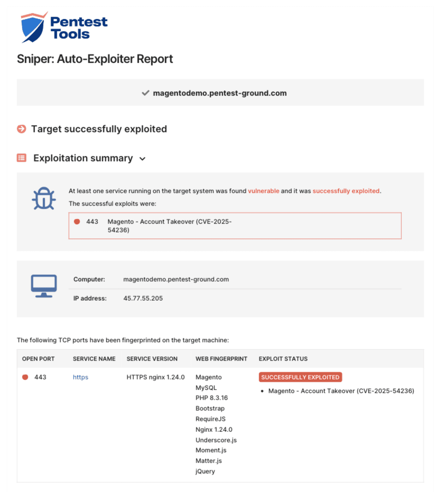 Here’s what a Sniper: Auto-Exploiter report looks like for CVE-2025-54236: